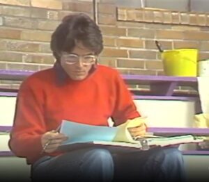 Angelo Pizzo reviews his screenplay in the Brownsburg gymnasium, site of sectional game filming. He cut scenes from the script both before and during filming.